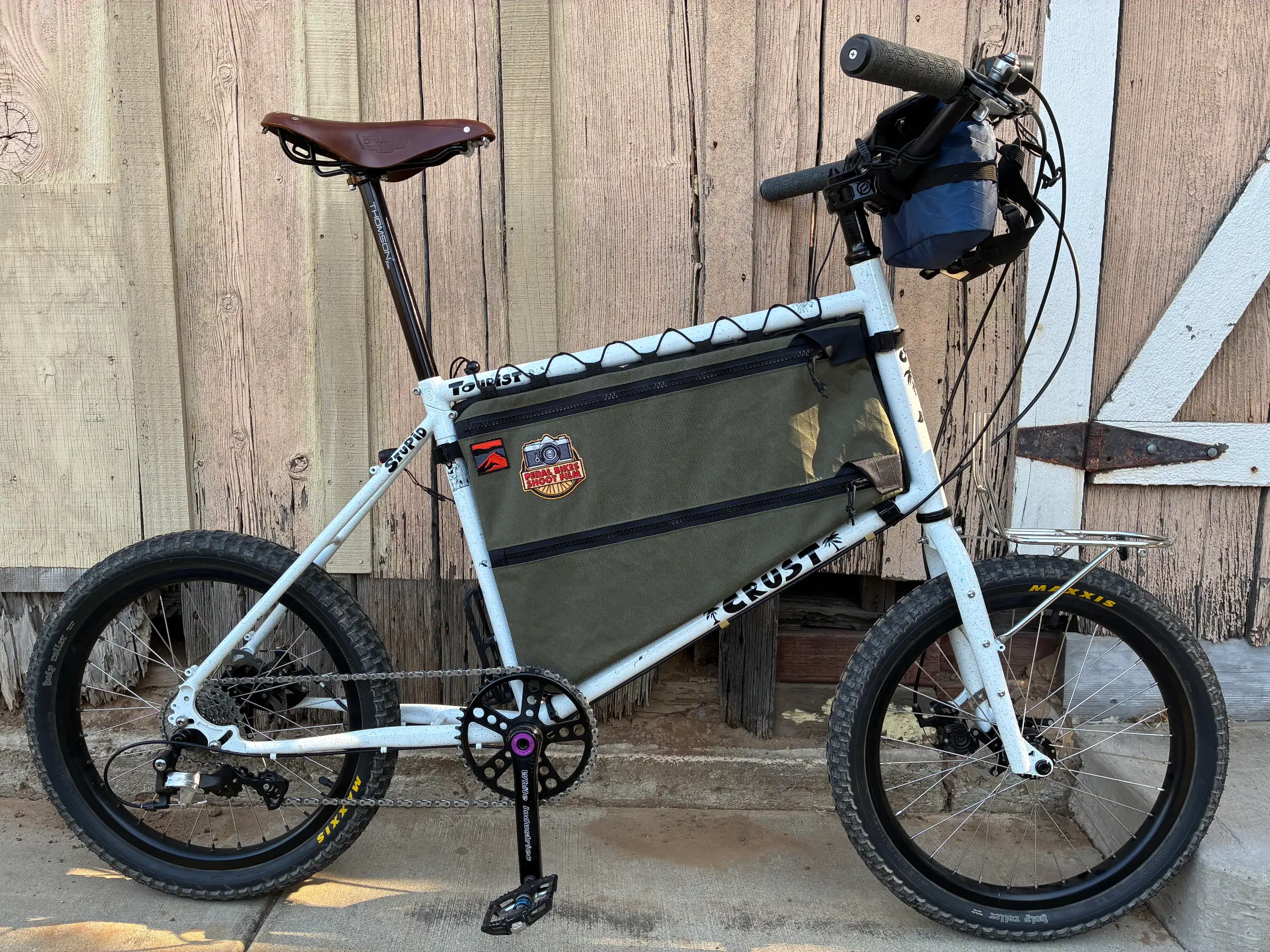 Custom framebag made-to-order for a perfect fit to your Crust Stupid Tourist. Select your fabric, features, and specify your frame size below.