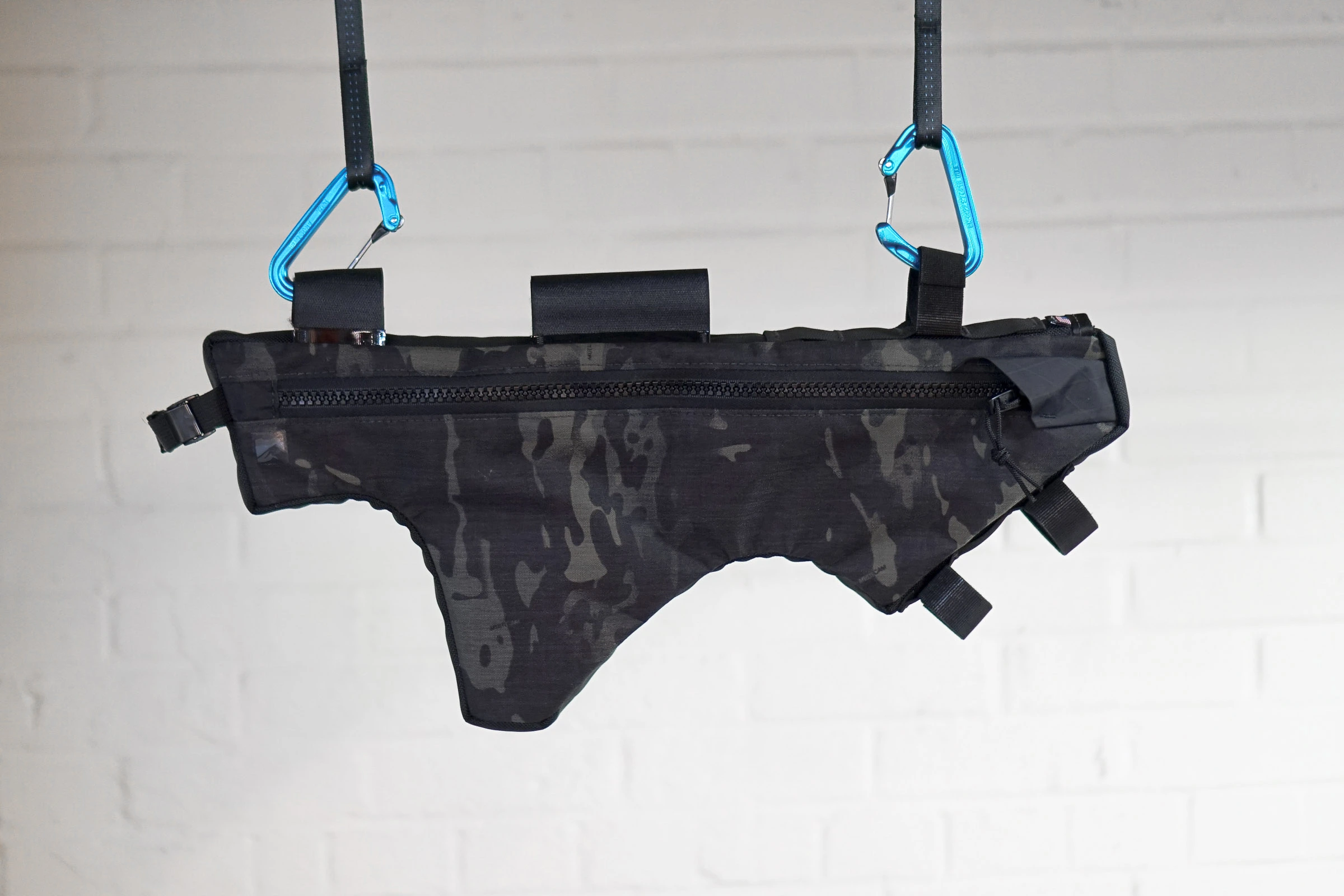 The frame bag was produced exactly to the specs I provided, is made of high-quality, abrasion-resistant materials, and fits my bike like a glove. The waterproof zipper is indispensable, and it’s angled zipper-garage is a nice touch. The bag has internal padding which holds it’s structure well, and all webbing is stitched internally, giving the outside of the bag a clean look.